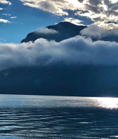 Mountains in the clouds on Lake Lucerne, Switzerland.