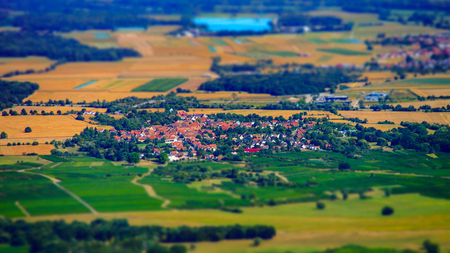 Beautiful tilt-shift aerial view to the colorful valley from the top of the hill, Alsace, France