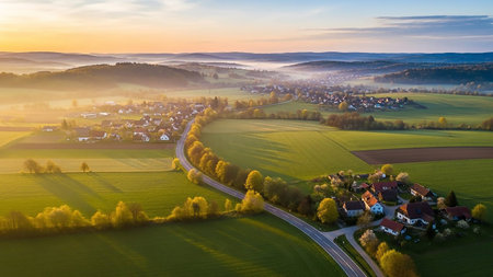 Sky showing winding asphalt road curves through a picturesque rural landscape with golden fields of crops, scattered houses, and rolling hills under a warm sunset...