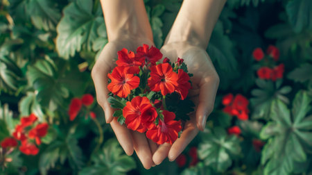 hands holding a bouquet of geraniums generative ai