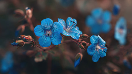 This captivating image showcases vibrant blue flowers adorned with dewdrops, set against a softly blurred background, highlighting tranquility and natural beauty.
