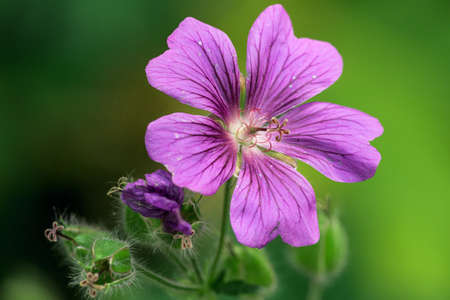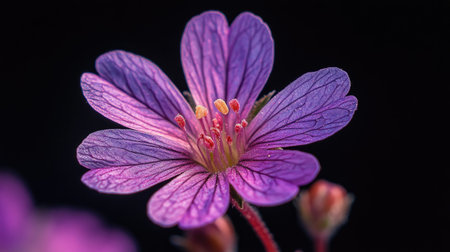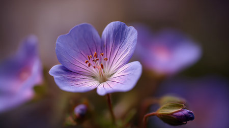 Beautiful purple geranium blossom illuminated in soft, gentle light.