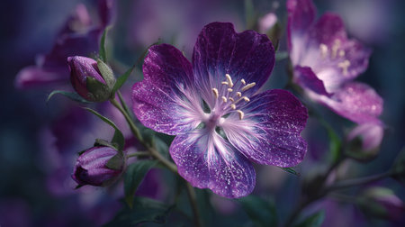 Deep Purple Geranium Blooms with Water Droplets on Petals