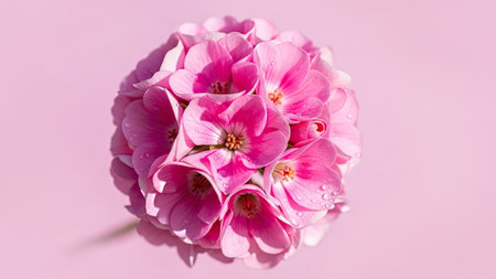 Pink geranium flowers on a pink background. Flat lay, top view.