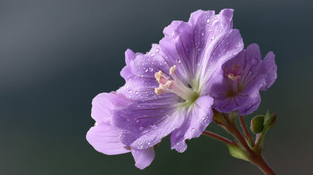Delicate purple flower glistens with water droplets against a dark background.
