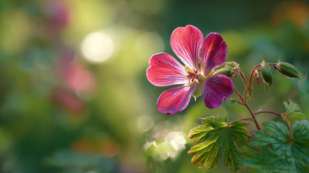 A sunlit portrait of a single Geranium, photographed outdoors on a clear, breezy day. Fresh, crisp air renders vivid detail in the leave veins glowing with gentle backlight. The background falls into a soft natural bokeh of greenery, colors true-to-life, organic beauty in pure sunlight.