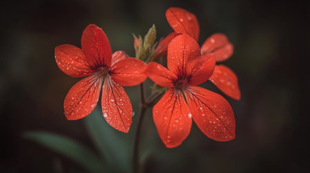 Close-up view of vibrant red flowers adorned with raindrops, showcasing their delicate beauty in a serene natural setting. Perfect for floral themes.