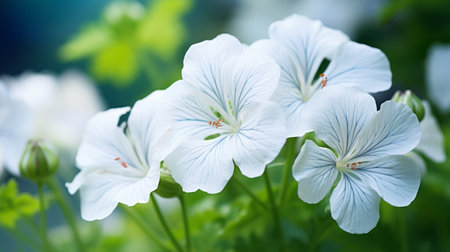 geranium flowers in bloom, captured in the style of zeiss batis 18mm f/2.8, shine elegantly in this uhd image. the airy silver and indigo tones of the background complement the delicate white petals. evoking the spirit of chinese painting and nature-inspired imagery, this flower wallpaper exudes a calming aesthetic with its light white and beige hues captured by the pentax smc fa 31mm f/1.8 al
