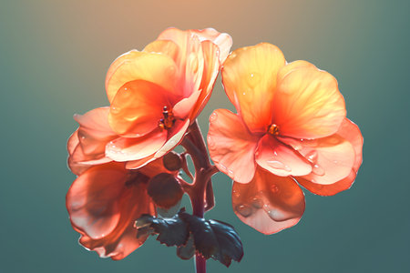 Bright orange begonia flowers with water drops on petals on green background