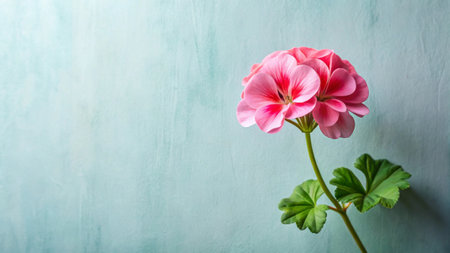 Pink geranium flower on a blue background. Place for text.