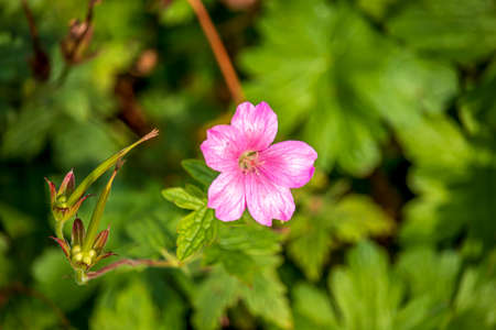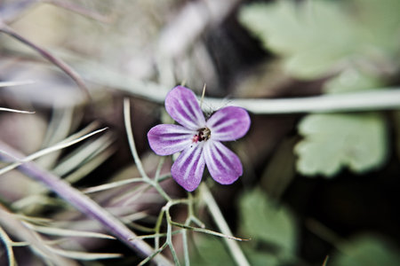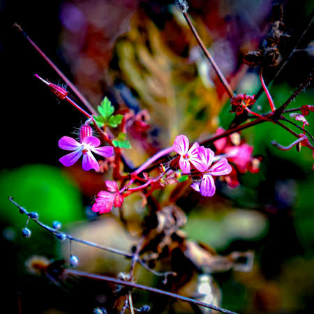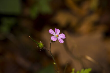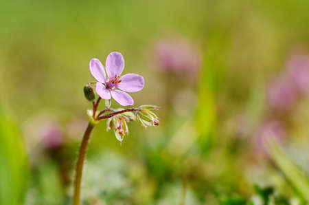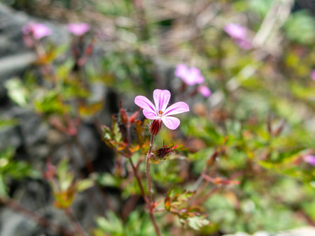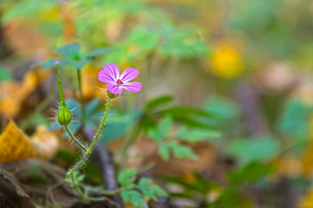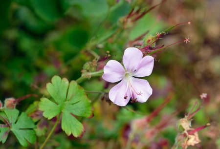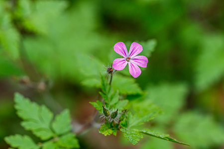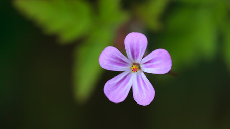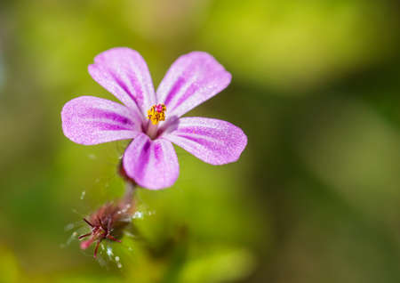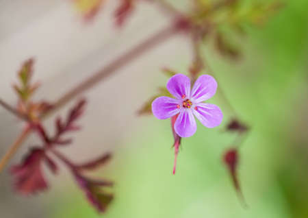 Flower of herb robert or Geranium robertianum close-up with bokeh background, selective focus, shallow DOF.