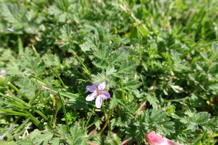 Small clusters of delicate purple flowers of Erodium cicutarium grow amidst vibrant green foliage showing nature's beauty in early spring.