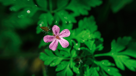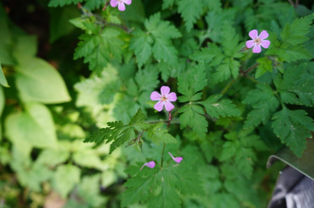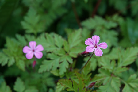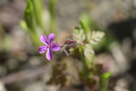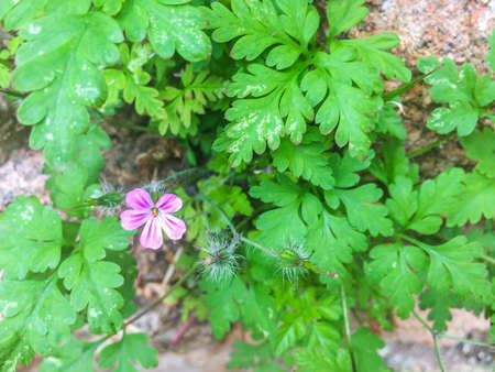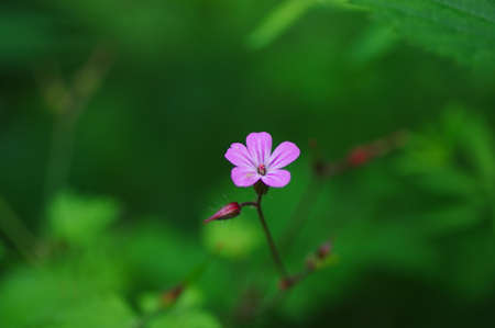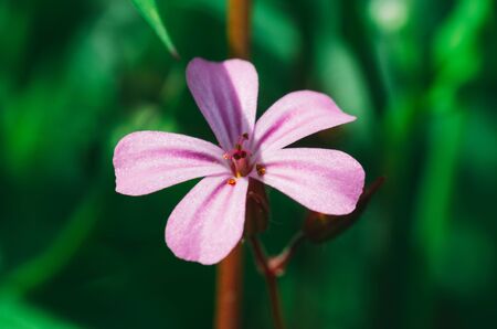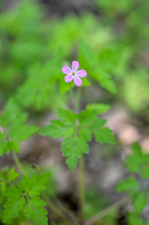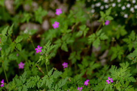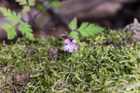Natural closeup on the small colorful pink flower of the roberts or Scots Geranium robertianum in the forest