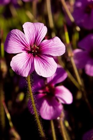 Flower with five purple petals and yellow stamens. Out of focus background and selective focus and bokeh effect