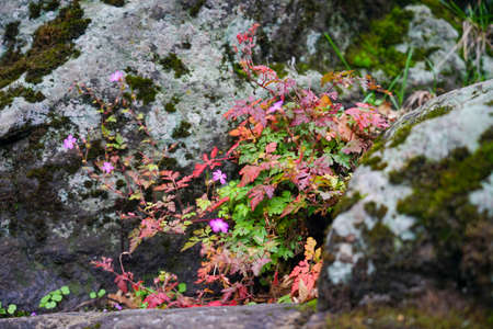 pink, wild, forest flower on the background of yellowed, fallen leaves in November.