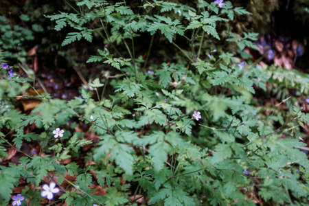 Beautiful white wild forest flower. Geranium robertianum, or herb-Robert, red robin, death come quickly, storksbill, stinking Bob, squinter-pip, crow's foot, Roberts geranium
