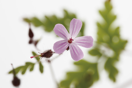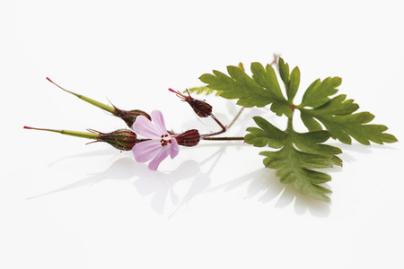 Herb Robert, Geranium robertianum, flower and foliage isolated against white