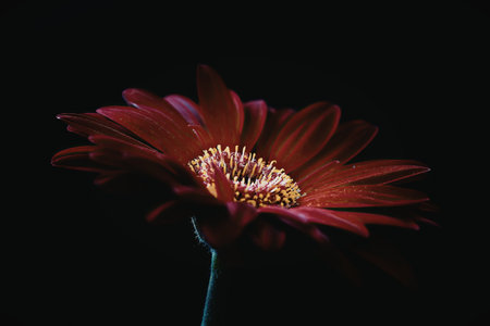 Close-up of a vibrant orange gerbera daisy, standing out against a dark backdrop. The mood is mysterious and elegant.