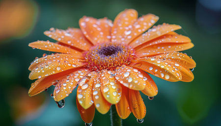 A vibrant orange gerbera daisy with water droplets scattered on its petals, surrounded by soft-focus greenery in the background