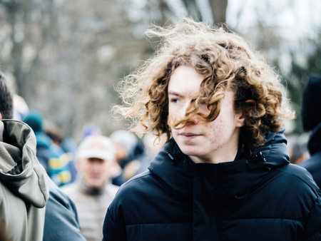 Carefree yong boy with curly hair at second demonstration against the new pension reform to be presented next month by French Prime Minister Elisabeth Borne