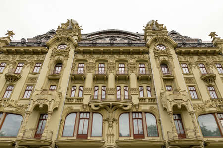 Ukraine, Odessa, Deribasivska Street, 13th of June 2019. Impressive historical green building with statues and stucco decorations.