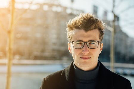 Young man walking, smart casual on an autumn day on a street of European City. Lifestyle Photography