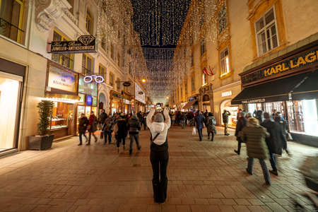 Vienna, Austria - December 2017: Tourist woman taking pictures at the Christmas decorations on Vienna busiest street