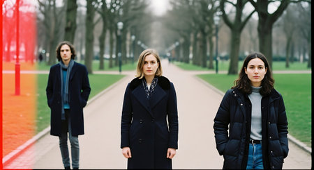 Three individuals dressed in winter coats walking down a tree-lined path in a park on an overcast day.