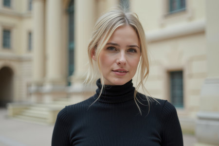 A portrait of a young blonde woman in a black turtleneck sweater standing outside a building.