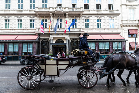 Vienna, Austria - October 14, 2022: Facade of the Sacher Hotel, a classic building with a horse carriage and its driver in Innere Stadt, Vienna, Austria