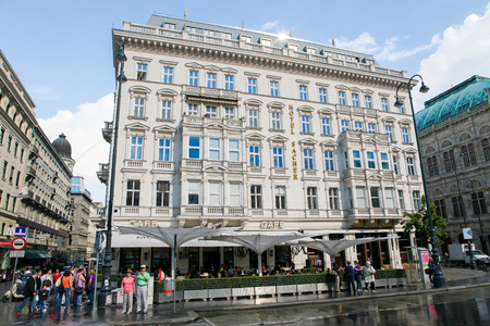 VIENNA, AUSTRIA - MAY 25: The Hotel Sacher, a five-star hotel located in the Innere Stadt first district of Vienna, Austria, next to the Vienna State Opera, on May 25, 2010. It is famous for the specialty of the house, the Sachertorte, a chocolate cake.