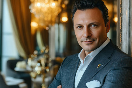 Hotel manager confidently posing with arms crossed in an elegant lobby, embodying professionalism and sophistication in the luxury hospitality industry