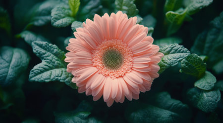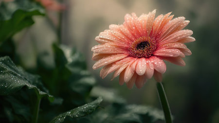 The Gerbera daisy in light fog, dew on leaves, light soft diffused, three-quarter view