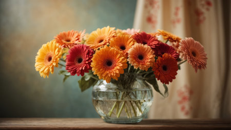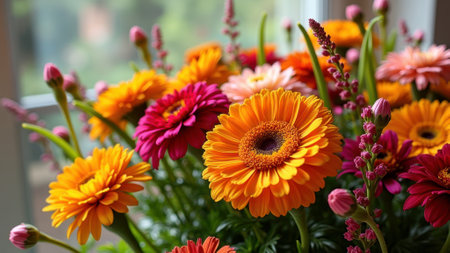 Vibrant bouquet of orange and pink gerbera daisies by a window. That the image is generated using AI.