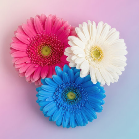 Three cheerful Gerbera daisies showcasing a beautiful spectrum of pink white and blue petals are captured in this delightful close-up image perfect for adding natural beauty.