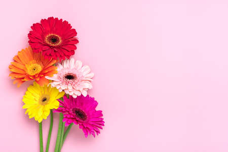Bouquet of gerberas on pink background Top view Flat lay Holiday greeting card Happy moter's day, 8 March, Valentine's day, Easter concept Copy space Mock up.