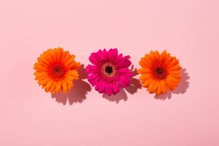 Beautiful orange flowers gerbera daisy on paper pink background. Minimal flowers concept in hard light with shadows. Abstract backdrop. Top view, flat lay.