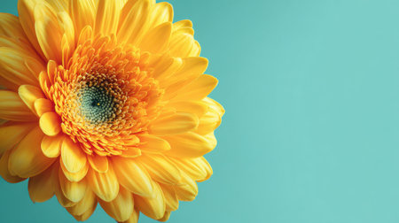 A vibrant yellow flower showcases its vivid petals and green center, contrasting beautifully with a smooth turquoise backdrop. The scene evokes feelings of joy and warmth.