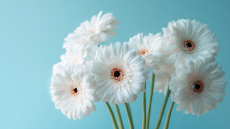 White gerbera daisies in bloom against a soft blue background.