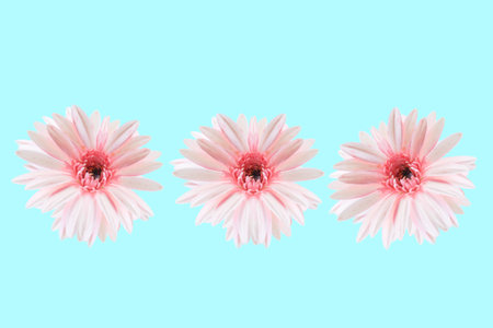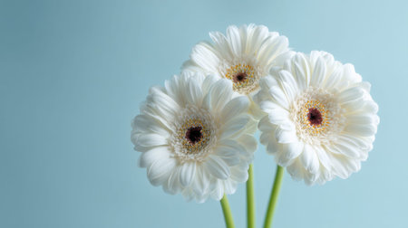 Trio of white gerbera daisies on light blue background.