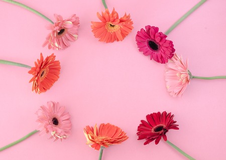 Circle formed with flowers of various colors on pink background. Space to copy.