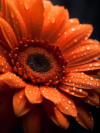 Close-up of a vibrant orange gerbera daisy, standing out against a dark backdrop. The mood is mysterious and elegant.