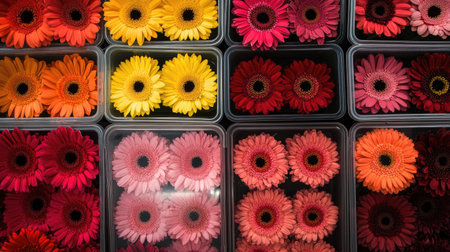 Vibrant red, orange, yellow, and pink flowers in plastic boxes, stacked and ready for sale at flower shops.