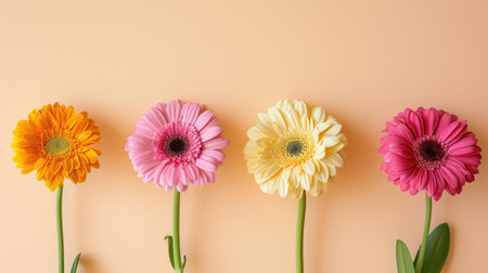 Four Vibrant Gerbera Daisies Lined Up on Peach Background