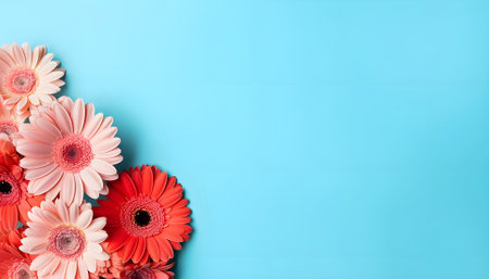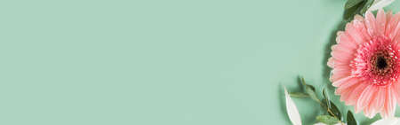 Elegant Pink gerbera on a turquoise color background. Romantic greeting card floral template with space for text.