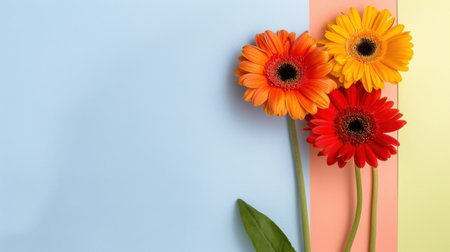 Three orange gerbera flowers on pastel pink and blue background