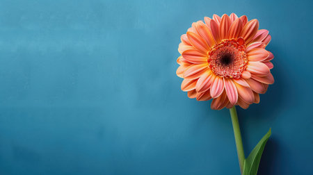 Single vibrant orange gerbera daisy against blue background with copy space on left