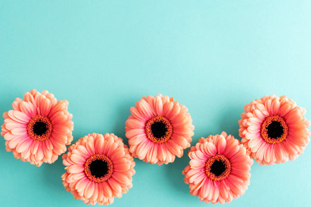 Five pink gerbera flowers on a turquoise background. Top view, flat lay, copy space.