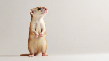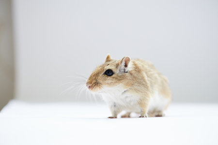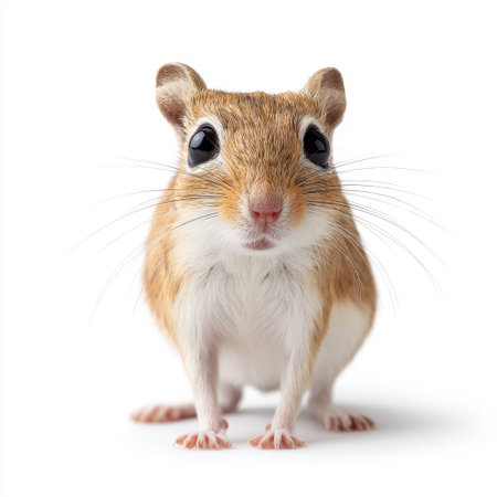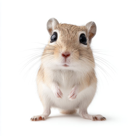 This charming image features an adorable gerbil with big eyes, standing on its front paws against a soft white background, highlighting its playful personality.