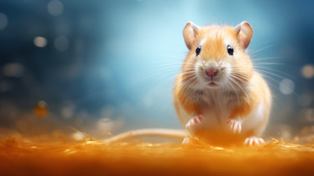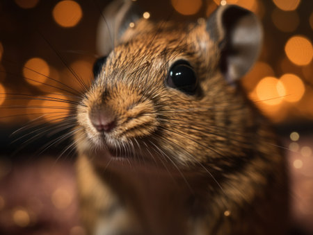 A small rodent, featuring soft fur and prominent whiskers, stands on its hind legs with paws together. The background showcases softly glowing lights that enhance the cozy ambiance of the environment.